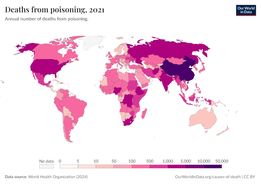 World Health Organization (2024) – with major processing by Our World in Data. “Deaths from poisoning” [dataset]. World Health Organization, “Global Health Estimates” [original data]. Retrieved March 2, 2026 from https://add-force-datapage.owid.pages.dev/grapher/deaths-from-poisonings-ghe