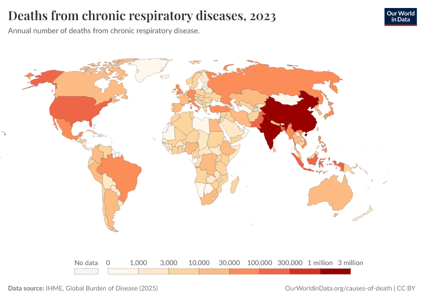 IHME, Global Burden of Disease (2025) – with major processing by Our World in Data. “Deaths from chronic respiratory diseases” [dataset]. IHME, Global Burden of Disease, “Global Burden of Disease - Deaths” [original data]. Retrieved March 2, 2026 from https://add-force-datapage.owid.pages.dev/grapher/deaths-from-respiratory-disease