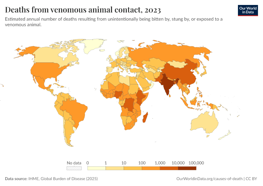 IHME, Global Burden of Disease (2025) – with major processing by Our World in Data. “Deaths from venomous animal contact” [dataset]. IHME, Global Burden of Disease, “Global Burden of Disease - Deaths” [original data]. Retrieved March 2, 2026 from https://add-force-datapage.owid.pages.dev/grapher/deaths-from-venomous-animal-contact