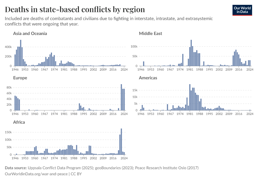 Uppsala Conflict Data Program (2025); geoBoundaries (2023); Peace Research Institute Oslo (2017) – processed by Our World in Data. “Deaths in state-based conflicts by region” [dataset]. Uppsala Conflict Data Program, “Georeferenced Event Dataset v25.1”; geoBoundaries, “geoBoundaries - Comprehensive Global Administrative Zones (CGAZ) 6.0.0”; Peace Research Institute Oslo, “Battle deaths v3.1” [original data]. Retrieved March 2, 2026 from https://add-force-datapage.owid.pages.dev/grapher/deaths-in-state-based-conflicts-by-region