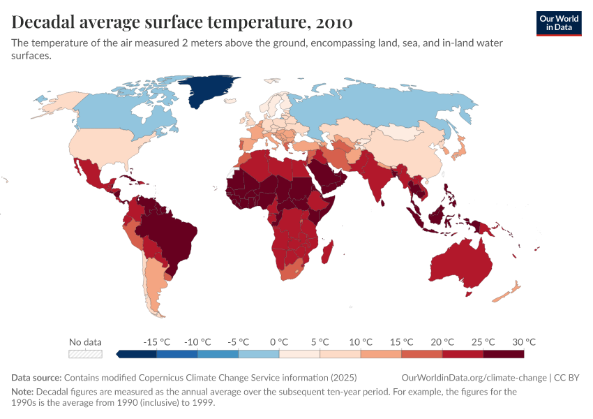“Data Page: Decadal average surface temperature”, part of the following publication: Hannah Ritchie, Pablo Rosado, and Veronika Samborska (2024) - “Climate Change”. Data adapted from Contains modified Copernicus Climate Change Service information. Retrieved from https://add-force-datapage.owid.pages.dev/grapher/decadal-average-surface-temperature [online resource]How to cite this data