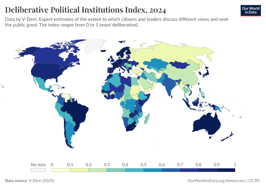 “Data Page: Deliberative political institutions index”, part of the following publication: Bastian Herre, Lucas Rodés-Guirao, and Esteban Ortiz-Ospina (2013) - “Democracy”. Data adapted from V-Dem. Retrieved from https://add-force-datapage.owid.pages.dev/grapher/deliberative-political-institutions-index [online resource]How to cite this data