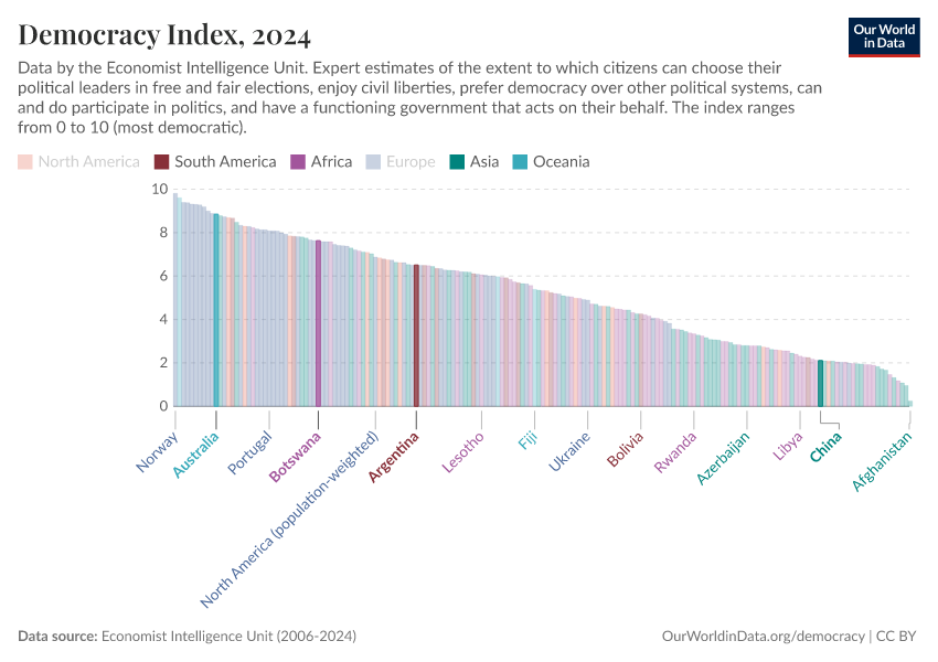 Economist Intelligence Unit (2006-2024) – processed by Our World in Data. “Democracy index – Economist Intelligence Unit” [dataset]. Economist Intelligence Unit, “Democracy Index 2021: The China challenge”; Economist Intelligence Unit, “Democracy Index 2022: Frontline democracy and the battle for Ukraine”; Economist Intelligence Unit, “Democracy Index 2023: Age of Conflict”; Economist Intelligence Unit, “Democracy Index 2024: What's wrong with representative democracy?”; Gapminder, “Democracy Index v4”; Various sources, “Population” [original data]. Retrieved March 2, 2026 from https://add-force-datapage.owid.pages.dev/grapher/democracy-index-eiu