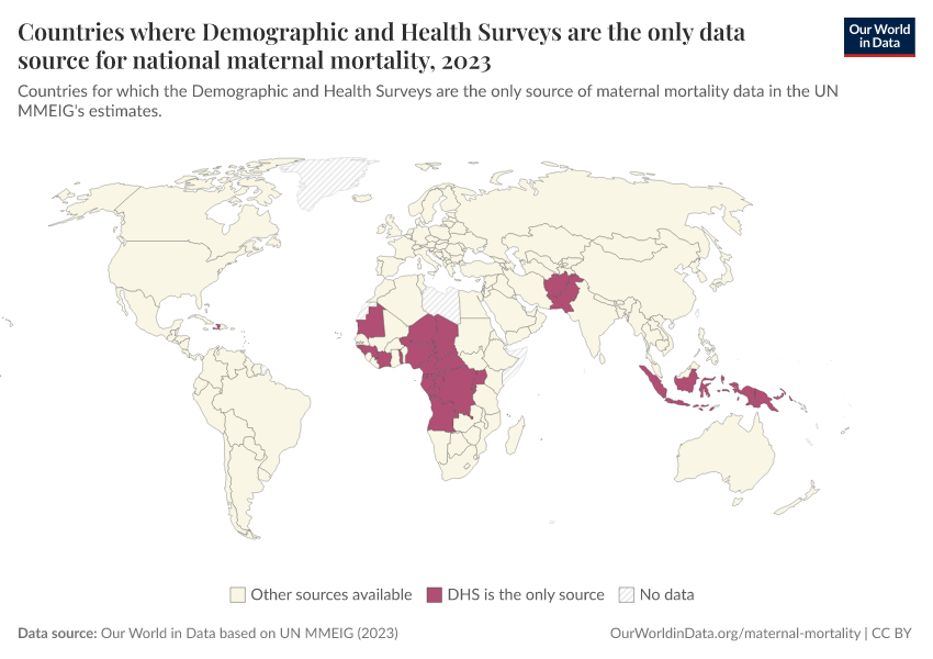 Our World in Data based on UN MMEIG (2023) – processed by Our World in Data. “Countries where Demographic and Health Surveys are the only data source for national maternal mortality” [dataset]. Our World in Data based on UN MMEIG, “Countries for which DHS is the only source for UN MMEIG maternal mortality estimates” [original data]. Retrieved March 2, 2026 from https://add-force-datapage.owid.pages.dev/grapher/dhs-is-the-only-source-of-maternal-mortality-data