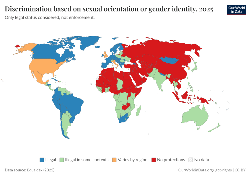 Equaldex (2025) – with major processing by Our World in Data. “Discrimination based on sexual orientation or gender identity” [dataset]. Equaldex, “Equaldex” [original data]. Retrieved March 2, 2026 from https://add-force-datapage.owid.pages.dev/grapher/discrimination-lgbt-equaldex