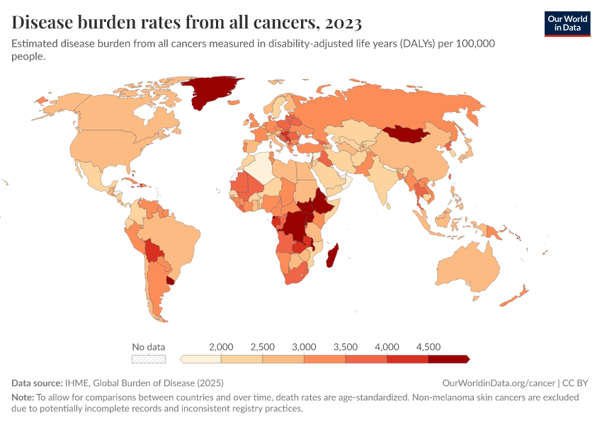 IHME, Global Burden of Disease (2025) – with major processing by Our World in Data. “Disease burden rates from all cancers” [dataset]. IHME, Global Burden of Disease, “Global Burden of Disease - DALYs” [original data]. Retrieved March 2, 2026 from https://add-force-datapage.owid.pages.dev/grapher/disease-burden-rates-from-cancers