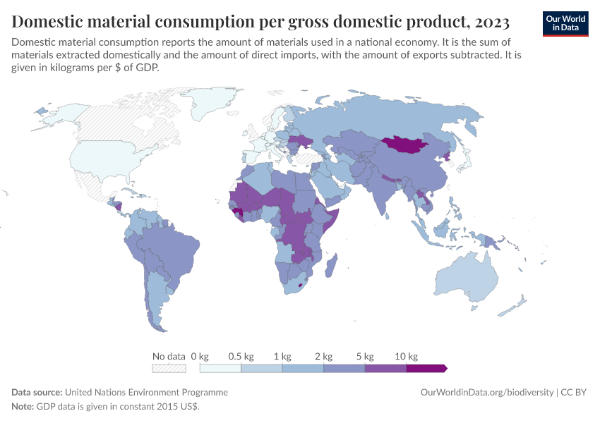 United Nations Environment Programme – processed by Our World in Data. “Domestic material consumption per gross domestic product” [dataset]. United Nations Environment Programme, “WESR / Global Material Flows Database” [original data]. Retrieved March 2, 2026 from https://add-force-datapage.owid.pages.dev/grapher/domestic-material-consumption-per-unit-of-gdp