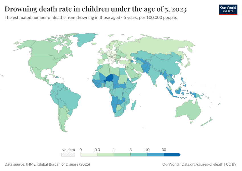IHME, Global Burden of Disease (2025) – with major processing by Our World in Data. “Drowning death rate in children under the age of 5” [dataset]. IHME, Global Burden of Disease, “Global Burden of Disease - Deaths” [original data]. Retrieved March 2, 2026 from https://add-force-datapage.owid.pages.dev/grapher/drowning-death-rates-under-5