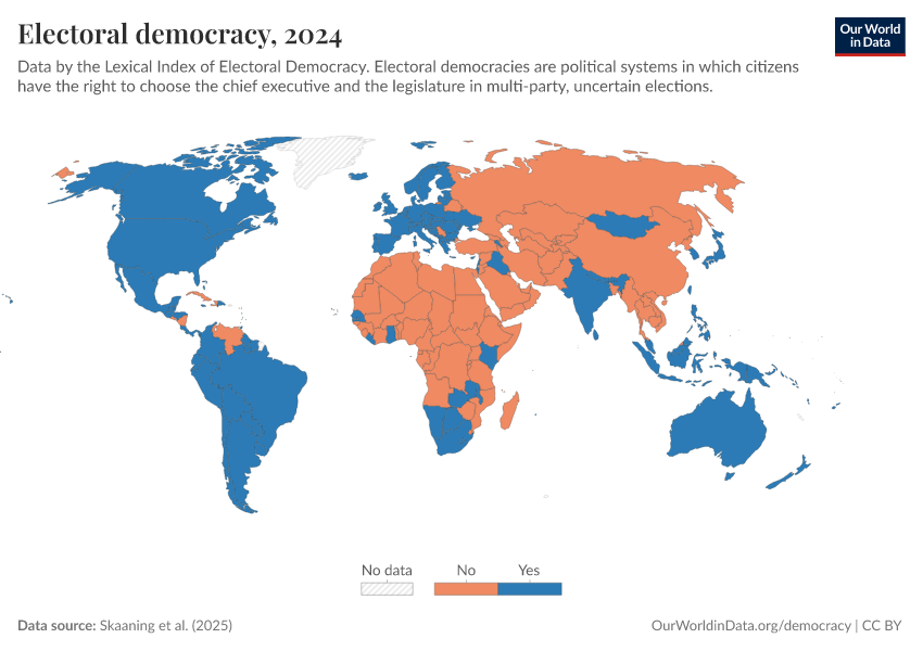 Skaaning et al. (2025) – processed by Our World in Data. “Electoral democracy” [dataset]. Skaaning et al., “Lexical Index of Electoral Democracy (LIED) v6.8” [original data]. Retrieved March 2, 2026 from https://add-force-datapage.owid.pages.dev/grapher/electoral-democracy-lexical