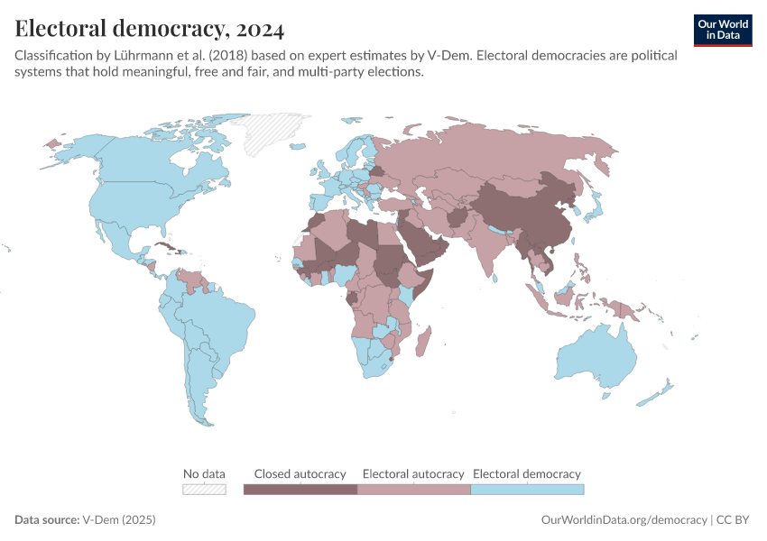 V-Dem (2025) – processed by Our World in Data. “Political regime – reduced” [dataset]. V-Dem, “Democracy report v15” [original data]. Retrieved March 2, 2026 from https://add-force-datapage.owid.pages.dev/grapher/electoral-democracy-row