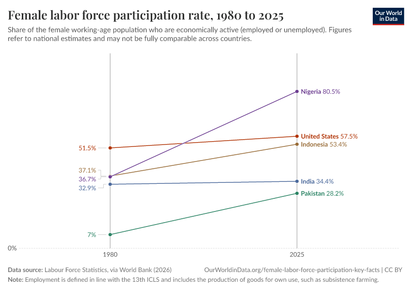 “Data Page: Female labor force participation rate”. Our World in Data (2026). Data adapted from Labour Force Statistics, via World Bank. Retrieved from https://add-force-datapage.owid.pages.dev/grapher/female-labor-force-participation-rates-slopes [online resource]How to cite this data