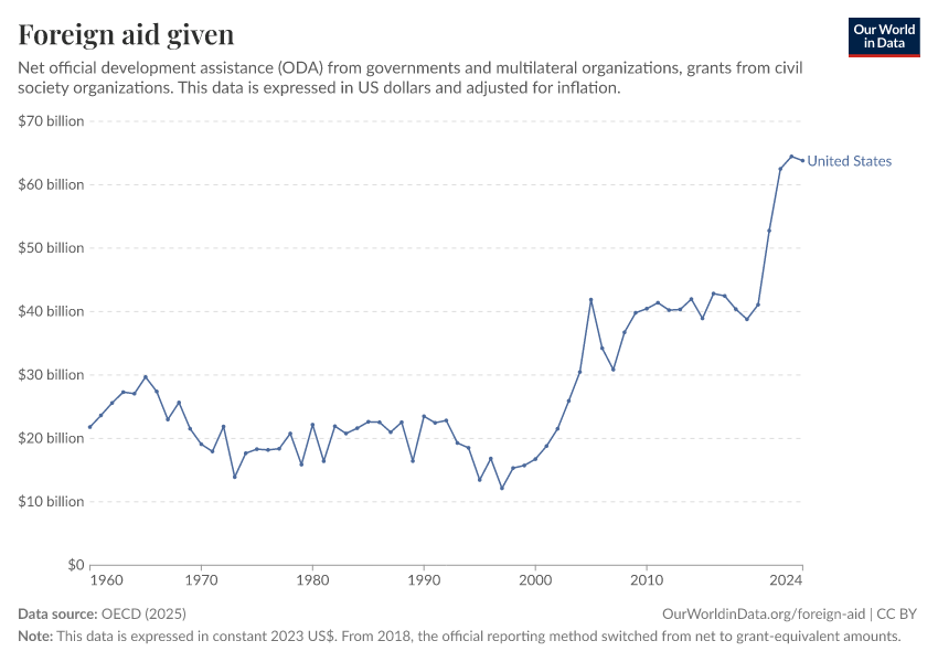 OECD (2025) – with major processing by Our World in Data. “Foreign aid given – Net disbursements” [dataset]. OECD, “OECD Official Development Assistance (ODA) - DAC1: Flows by provider (ODA+OOF+Private)”; OECD, “OECD Official Development Assistance (ODA) - DAC2A: Aid (ODA) disbursements to countries and regions” [original data]. Retrieved March 2, 2026 from https://add-force-datapage.owid.pages.dev/grapher/foreign-aid-given-net