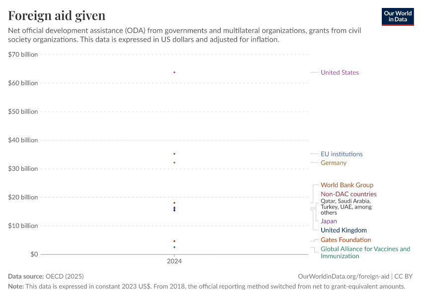 OECD (2025) – with major processing by Our World in Data. “Foreign aid given – Net disbursements” [dataset]. OECD, “OECD Official Development Assistance (ODA) - DAC1: Flows by provider (ODA+OOF+Private)”; OECD, “OECD Official Development Assistance (ODA) - DAC2A: Aid (ODA) disbursements to countries and regions” [original data]. Retrieved March 2, 2026 from https://add-force-datapage.owid.pages.dev/grapher/foreign-aid-given-net