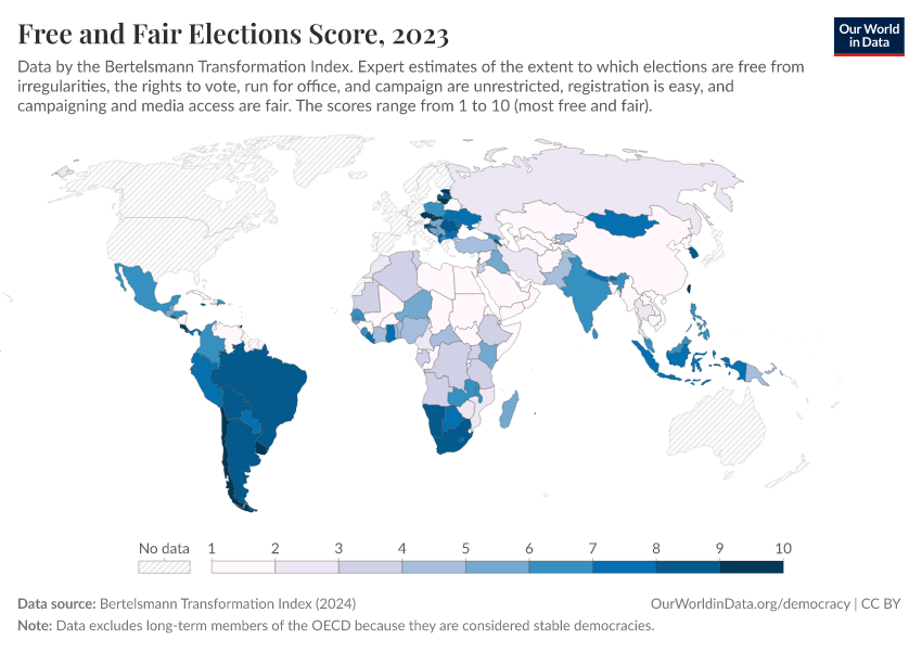 Bertelsmann Transformation Index (2024) – processed by Our World in Data. “Free and Fair Elections Score” [dataset]. Bertelsmann Transformation Index, “Bertelsmann Transformation Index, Scores” [original data]. Retrieved March 2, 2026 from https://add-force-datapage.owid.pages.dev/grapher/free-fair-elections-bti