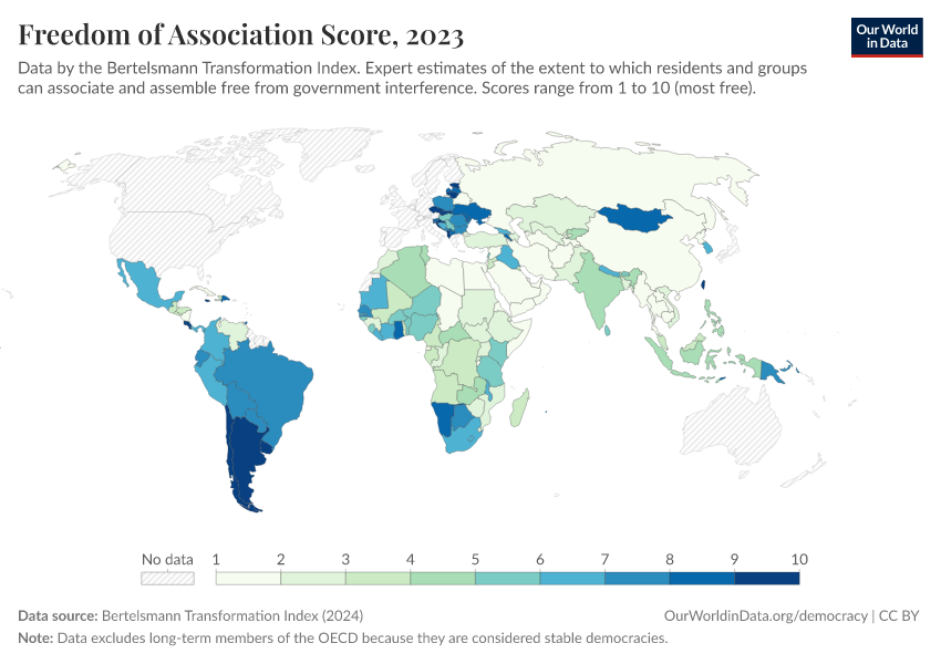 “Data Page: Freedom of Association Score”, part of the following publication: Bastian Herre, Lucas Rodés-Guirao, and Esteban Ortiz-Ospina (2013) - “Democracy”. Data adapted from Bertelsmann Transformation Index. Retrieved from https://add-force-datapage.owid.pages.dev/grapher/freedom-of-association-score-bti [online resource]How to cite this data