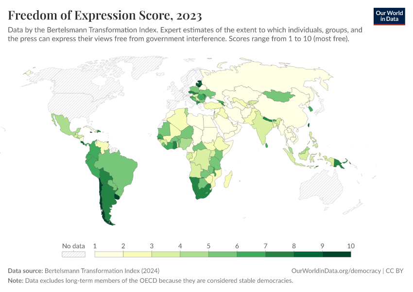 “Data Page: Freedom of Expression Score”, part of the following publication: Bastian Herre, Lucas Rodés-Guirao, and Esteban Ortiz-Ospina (2013) - “Democracy”. Data adapted from Bertelsmann Transformation Index. Retrieved from https://add-force-datapage.owid.pages.dev/grapher/freedom-of-expression-score-bti [online resource]How to cite this data