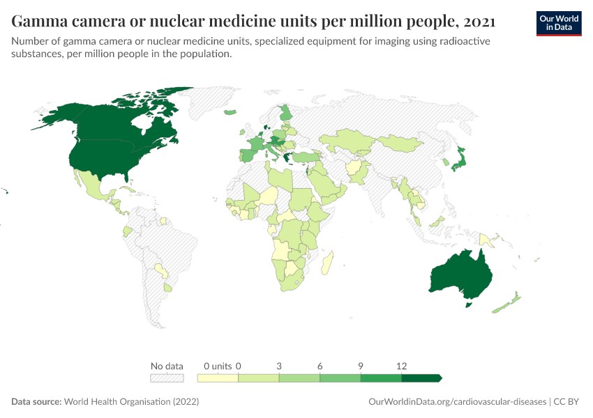 “Data Page: Gamma camera or nuclear medicine units per million people”, part of the following publication: Saloni Dattani, Veronika Samborska, Hannah Ritchie, and Max Roser (2023) - “Cardiovascular Diseases”. Data adapted from World Health Organisation. Retrieved from https://add-force-datapage.owid.pages.dev/grapher/gamma-camera-or-nuclear-medicine-availability [online resource]How to cite this data