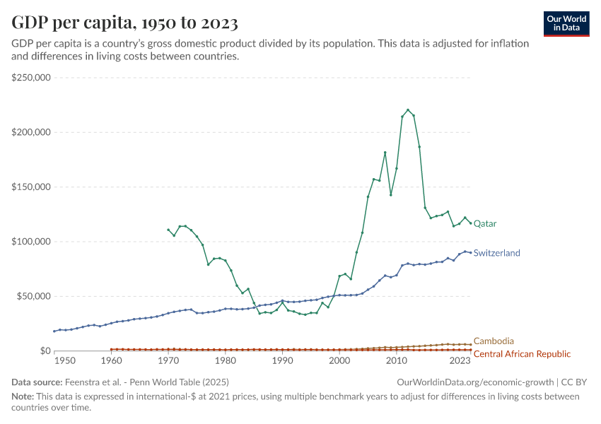 “Data Page: GDP per capita”, part of the following publication: Max Roser, Bertha Rohenkohl, Pablo Arriagada, Joe Hasell, Hannah Ritchie, and Esteban Ortiz-Ospina (2023) - “Economic Growth”. Data adapted from Feenstra et al.. Retrieved from https://add-force-datapage.owid.pages.dev/grapher/gdp-per-capita-penn-world-table [online resource]