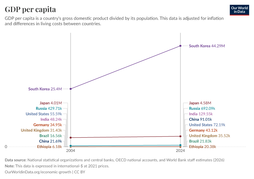 “Data Page: GDP per capita”, part of the following publication: Max Roser, Bertha Rohenkohl, Pablo Arriagada, Joe Hasell, Hannah Ritchie, and Esteban Ortiz-Ospina (2023) - “Economic Growth”. Data adapted from Eurostat, OECD, IMF, and World Bank. Retrieved from https://add-force-datapage.owid.pages.dev/grapher/gdp-per-capita-worldbank [online resource]How to cite this data