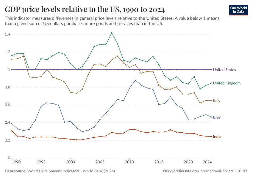 World Development Indicators - World Bank (2026) – processed by Our World in Data. “GDP price levels relative to the US – World Bank” [dataset]. World Development Indicators - World Bank, “World Development Indicators 125” [original data]. Retrieved March 2, 2026 from https://add-force-datapage.owid.pages.dev/grapher/gdp-price-levels-relative-to-the-us