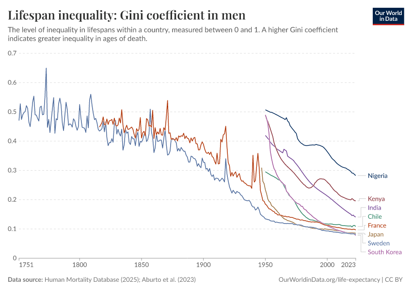 “Data Page: Lifespan inequality: Gini coefficient in men”, part of the following publication: Saloni Dattani, Lucas Rodés-Guirao, Hannah Ritchie, Esteban Ortiz-Ospina, and Max Roser (2023) - “Life Expectancy”. Data adapted from Human Mortality Database, United Nations. Retrieved from https://add-force-datapage.owid.pages.dev/grapher/gini-coefficient-of-lifespan-inequality-in-males [online resource]How to cite this data