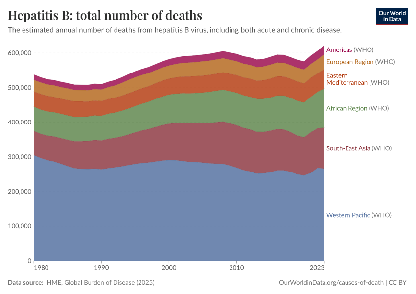 IHME, Global Burden of Disease (2025) – with major processing by Our World in Data. “Hepatitis B: total number of deaths” [dataset]. IHME, Global Burden of Disease, “Global Burden of Disease - Deaths” [original data]. Retrieved March 2, 2026 from https://add-force-datapage.owid.pages.dev/grapher/hepatitis-b-number-of-deaths