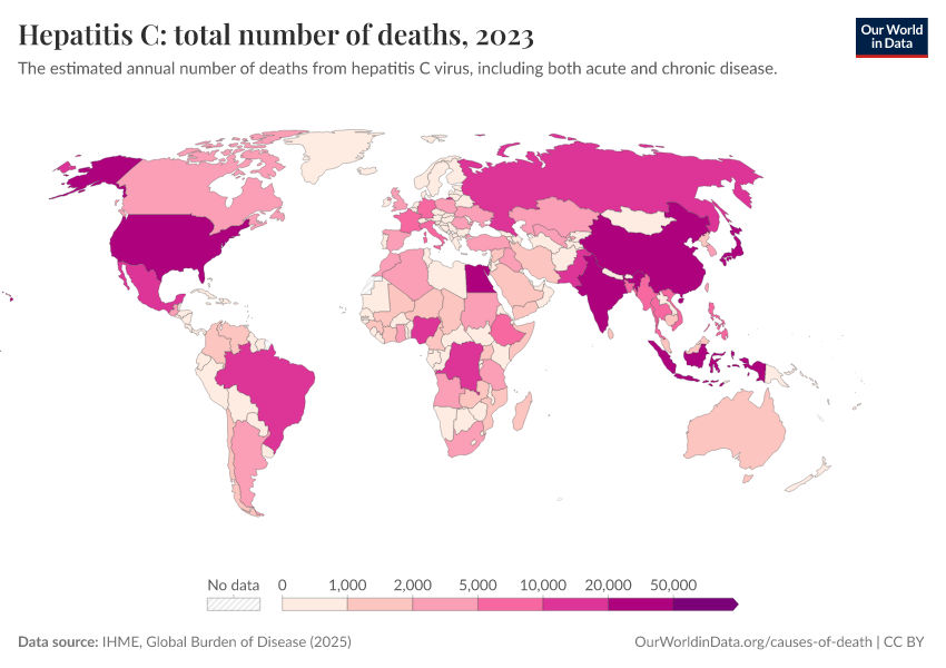IHME, Global Burden of Disease (2025) – with major processing by Our World in Data. “Hepatitis C: total number of deaths” [dataset]. IHME, Global Burden of Disease, “Global Burden of Disease - Deaths” [original data]. Retrieved March 2, 2026 from https://add-force-datapage.owid.pages.dev/grapher/hepatitis-c-number-of-deaths