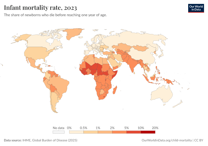 IHME, Global Burden of Disease (2025) – with minor processing by Our World in Data. “Infant mortality rate” [dataset]. IHME, Global Burden of Disease, “Global Burden of Disease - Child Mortality” [original data]. Retrieved March 2, 2026 from https://add-force-datapage.owid.pages.dev/grapher/infant-mortality-rate