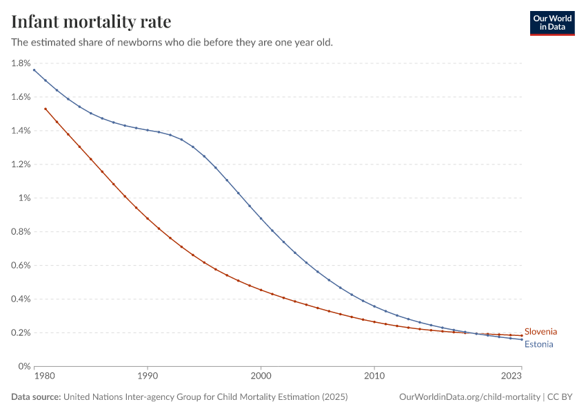 United Nations Inter-agency Group for Child Mortality Estimation (2025) – with minor processing by Our World in Data. “Infant mortality rate” [dataset]. United Nations Inter-agency Group for Child Mortality Estimation, “United Nations Inter-agency Group for Child Mortality Estimation”; Various sources, “Population” [original data]. Retrieved March 2, 2026 from https://add-force-datapage.owid.pages.dev/grapher/infant-mortality