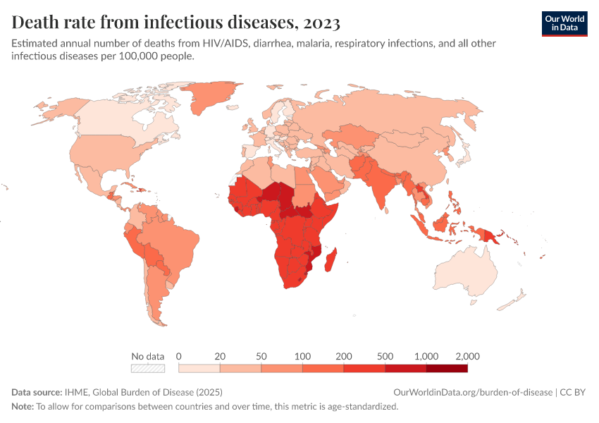 IHME, Global Burden of Disease (2025) – with major processing by Our World in Data. “Death rate from infectious diseases” [dataset]. IHME, Global Burden of Disease, “Global Burden of Disease - Deaths” [original data]. Retrieved March 2, 2026 from https://add-force-datapage.owid.pages.dev/grapher/infectious-disease-death-rates