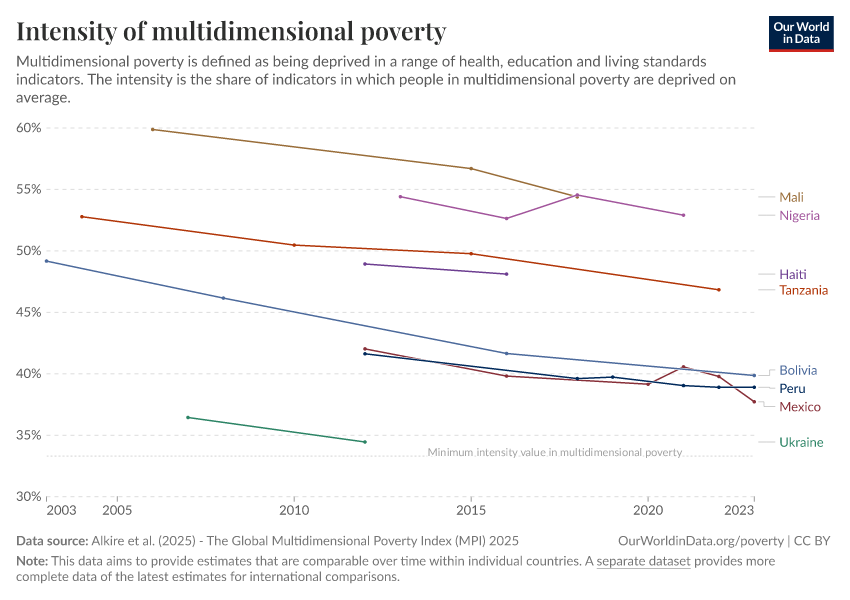 “Data Page: Intensity of multidimensional poverty”, part of the following publication: Joe Hasell, Bertha Rohenkohl, Pablo Arriagada, Esteban Ortiz-Ospina, and Max Roser (2022) - “Poverty”. Data adapted from Alkire et al.. Retrieved from https://add-force-datapage.owid.pages.dev/grapher/intensity-of-multidimensional-poverty-hot [online resource]How to cite this data