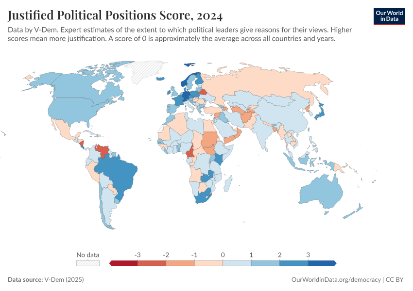 “Data Page: Justified political positions”, part of the following publication: Bastian Herre, Lucas Rodés-Guirao, and Esteban Ortiz-Ospina (2013) - “Democracy”. Data adapted from V-Dem. Retrieved from https://add-force-datapage.owid.pages.dev/grapher/justified-political-positions-score [online resource]How to cite this data