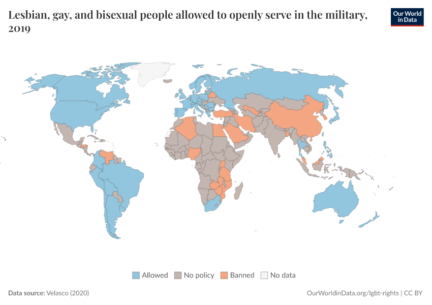 The indicator is coded as follows: Allowed (LGB people are allowed to serve in the military), No policy (there is no policy allowing nor banning LGB military service) and Banned (LGB people are banned to serve in the military).