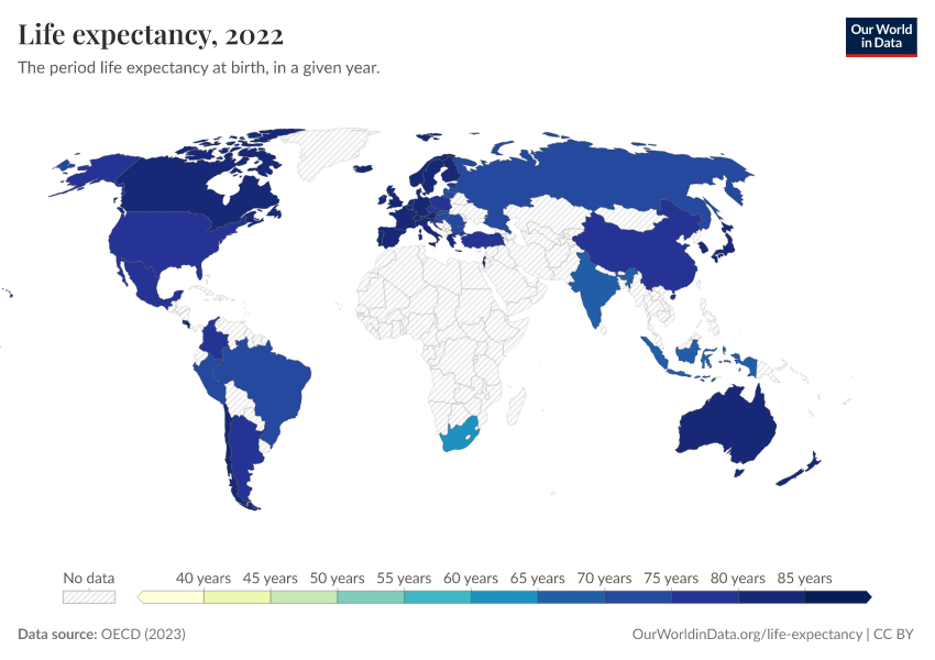 “Data Page: Life expectancy at birth”, part of the following publication: Saloni Dattani, Lucas Rodés-Guirao, Hannah Ritchie, Esteban Ortiz-Ospina, and Max Roser (2023) - “Life Expectancy”. Data adapted from OECD. Retrieved from https://add-force-datapage.owid.pages.dev/grapher/life-expectancy-at-birth-oecd [online resource]How to cite this data