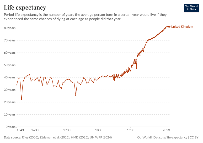 Riley (2005); Zijdeman et al. (2015); HMD (2025); UN WPP (2024) – with major processing by Our World in Data. “Life expectancy – Riley; Zijdeman et al.; HMD; UN WPP – Long-run data” [dataset]. Human Mortality Database, “Human Mortality Database”; United Nations, “World Population Prospects”; Zijdeman et al., “Life Expectancy at birth v2”; James C. Riley, “Estimates of Regional and Global Life Expectancy, 1800-2001” [original data]. Retrieved March 2, 2026 from https://add-force-datapage.owid.pages.dev:8789/20260302-102902/grapher/life-expectancy.html (archived on March 2, 2026).