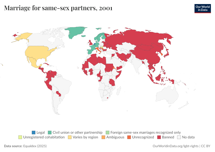 “Data Page: Marriage for same-sex partners”, part of the following publication: Bastian Herre and Pablo Arriagada (2023) - “LGBT+ Rights”. Data adapted from Equaldex. Retrieved from https://add-force-datapage.owid.pages.dev/grapher/marriage-same-sex-partners-equaldex [online resource]How to cite this data