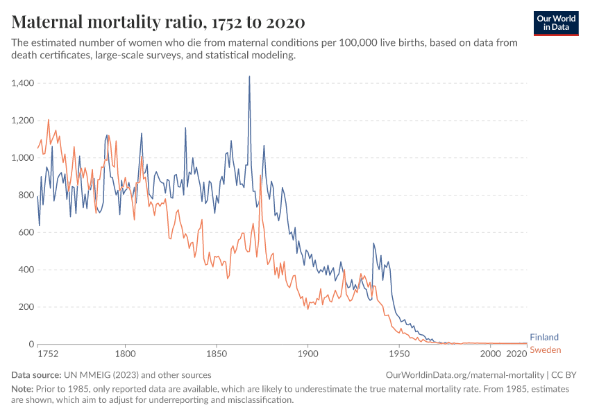 “Data Page: Maternal mortality ratio”, part of the following publication: Max Roser and Hannah Ritchie (2013) - “Maternal Mortality”. Data adapted from UN MMEIG (WHO, UNICEF, UNFPA, World Bank Group and UNDESA/ Population Division), WHO Mortality Database, United Nations, Gapminder. Retrieved from https://add-force-datapage.owid.pages.dev/grapher/maternal-mortality [online resource]