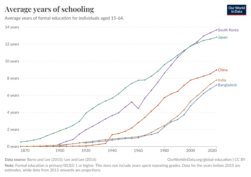 Barro and Lee (2015); Lee and Lee (2016) – with major processing by Our World in Data. “Average years of schooling” [dataset]. Barro and Lee, “Projections of Educational Attainment”; Lee and Lee, “Human Capital in the Long Run” [original data]. Retrieved March 2, 2026 from https://add-force-datapage.owid.pages.dev/grapher/mean-years-of-schooling-long-run