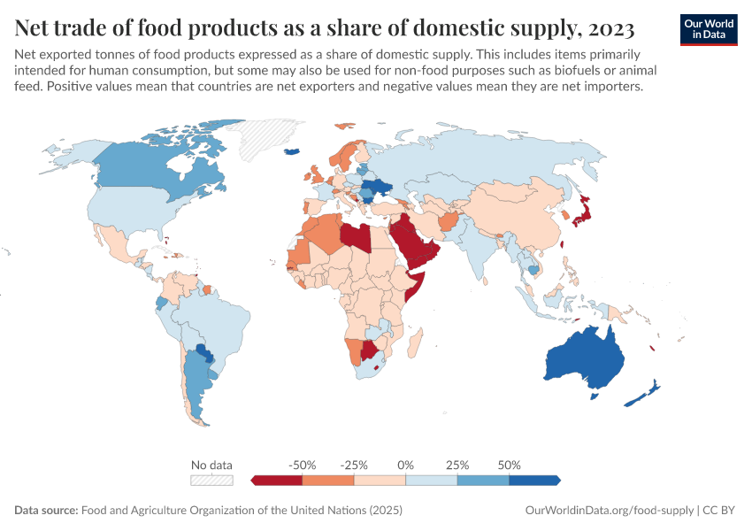 “Data Page: Net trade of food products as a share of domestic supply”, part of the following publication: Hannah Ritchie, Pablo Rosado, and Max Roser (2023) - “Agricultural Production”. Data adapted from Food and Agriculture Organization of the United Nations. Retrieved from https://add-force-datapage.owid.pages.dev/grapher/net-food-trade-as-a-share-of-domestic-supply [online resource]How to cite this data