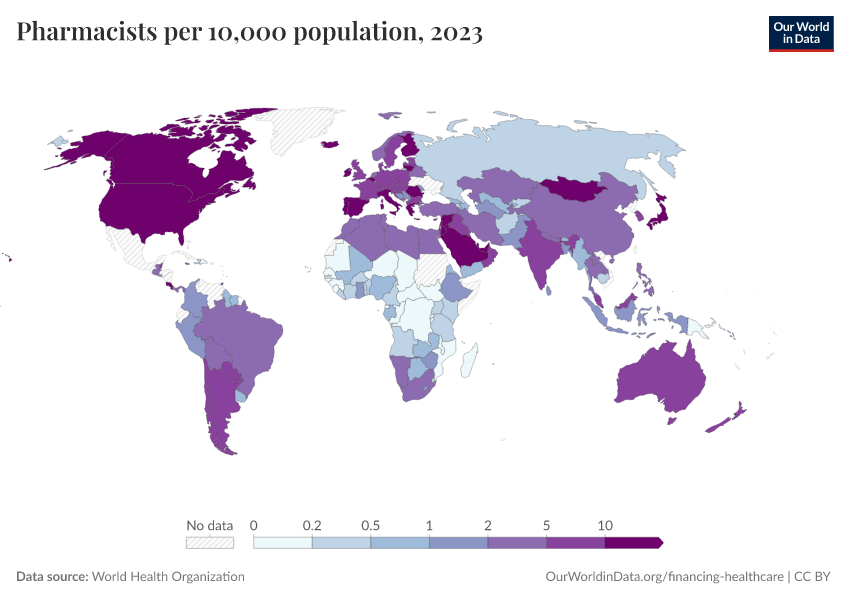 “Data Page: Pharmacists per 10,000 population”. Our World in Data (2026). Data adapted from World Health Organization. Retrieved from https://add-force-datapage.owid.pages.dev/grapher/pharmaceutical-personnel-per-1000 [online resource]How to cite this data