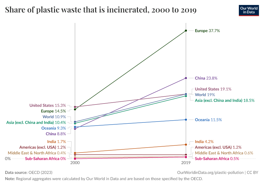 “Data Page: Share of plastic waste that is incinerated”, part of the following publication: Hannah Ritchie, Veronika Samborska, and Max Roser (2023) - “Plastic Pollution”. Data adapted from OECD. Retrieved from https://add-force-datapage.owid.pages.dev/grapher/plastic-waste-incinerated [online resource]How to cite this data