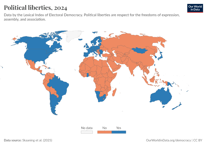 Skaaning et al. (2025) – processed by Our World in Data. “Political liberties” [dataset]. Skaaning et al., “Lexical Index of Electoral Democracy (LIED) v6.8” [original data]. Retrieved March 2, 2026 from https://add-force-datapage.owid.pages.dev/grapher/political-liberties-lexical