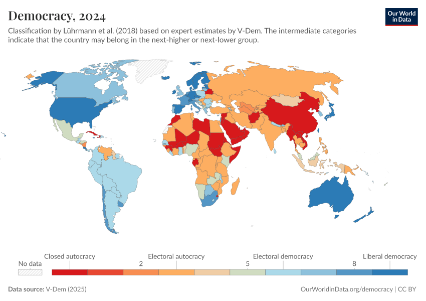 “Data Page: Political regime”, part of the following publication: Bastian Herre, Lucas Rodés-Guirao, and Esteban Ortiz-Ospina (2013) - “Democracy”. Data adapted from V-Dem. Retrieved from https://add-force-datapage.owid.pages.dev/grapher/political-regime-amb-row [online resource]How to cite this data
