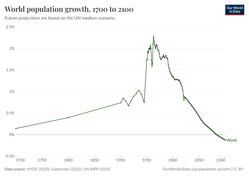 “Data Page: World population growth”, part of the following publication: Hannah Ritchie, Lucas Rodés-Guirao, Edouard Mathieu, Marcel Gerber, Esteban Ortiz-Ospina, Joe Hasell, and Max Roser (2023) - “Population Growth”. Data adapted from PBL Netherlands Environmental Assessment Agency, Gapminder, United Nations. Retrieved from https://add-force-datapage.owid.pages.dev/grapher/population-growth-rate [online resource]How to cite this data