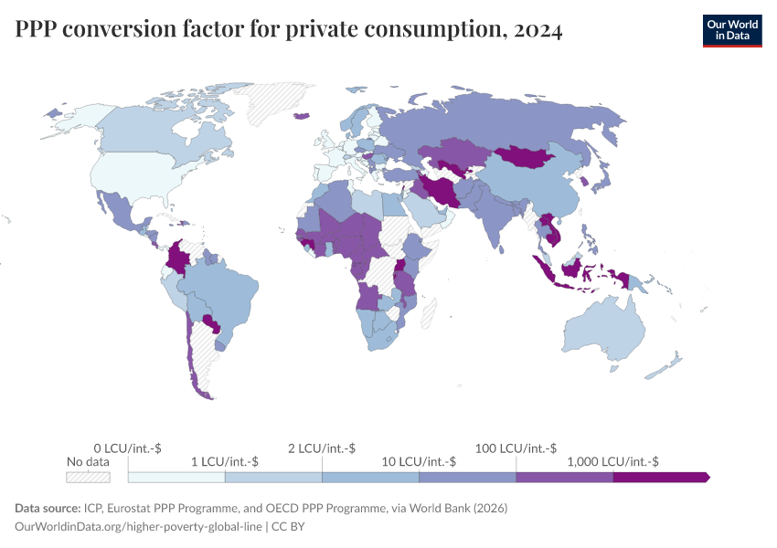 “Data Page: PPP conversion factor for private consumption”. Our World in Data (2026). Data adapted from ICP, Eurostat PPP Programme, and OECD PPP Programme, via World Bank. Retrieved from https://add-force-datapage.owid.pages.dev/grapher/ppp-conversion-factor-for-private-consumption [online resource]How to cite this data