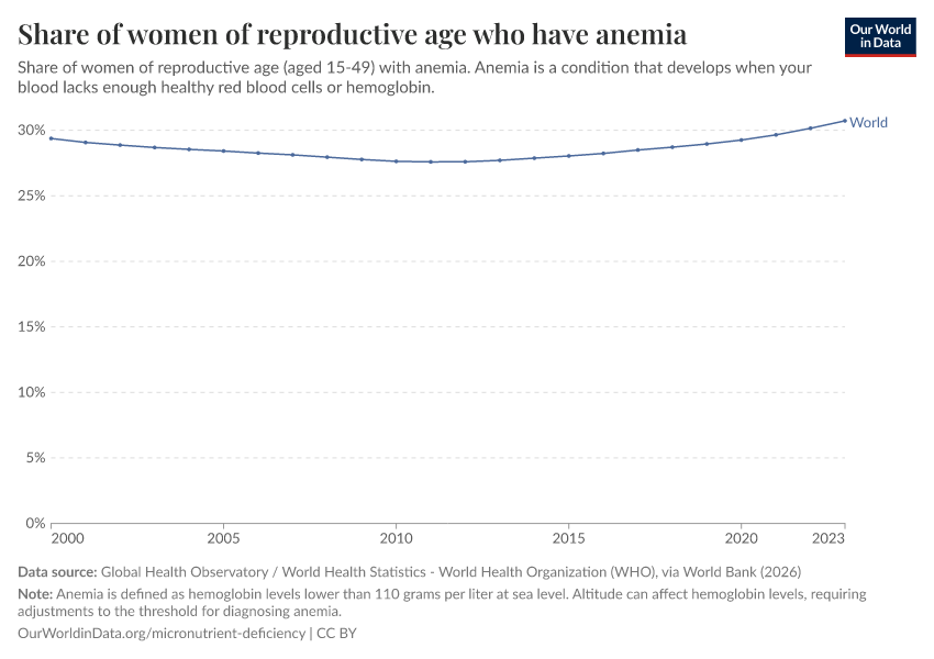 “Data Page: Share of women of reproductive age who have anemia”. Our World in Data (2026). Data adapted from Global Health Observatory / World Health Statistics - World Health Organization (WHO), via World Bank. Retrieved from https://add-force-datapage.owid.pages.dev/grapher/prevalence-of-anemia-in-women-of-reproductive-age-aged-15-29 [online resource]How to cite this data