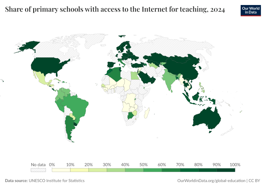 “Data Page: Share of primary schools with access to the Internet for teaching”. Our World in Data (2026). Data adapted from UNESCO Institute for Statistics. Retrieved from https://add-force-datapage.owid.pages.dev/grapher/primary-schools-with-access-to-internet [online resource]How to cite this data