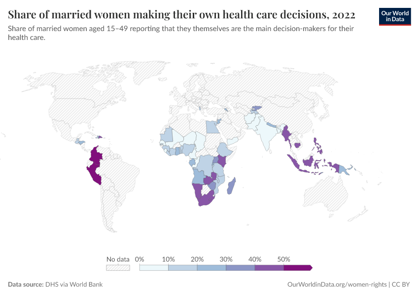 “Data Page: Share of married women making their own health care decisions”, part of the following publication: Bastian Herre, Veronika Samborska, Pablo Arriagada, and Hannah Ritchie (2023) - “Women’s Rights”. Data adapted from World Bank Gender Statistics. Retrieved from https://add-force-datapage.owid.pages.dev/grapher/proportion-of-women-who-make-their-own-informed-health-care-decisions [online resource]How to cite this data