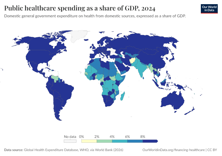 “Data Page: Public healthcare spending as a share of GDP”. Our World in Data (2026). Data adapted from Global Health Expenditure Database, WHO, via World Bank. Retrieved from https://add-force-datapage.owid.pages.dev/grapher/public-healthcare-spending-share-gdp [online resource]How to cite this data
