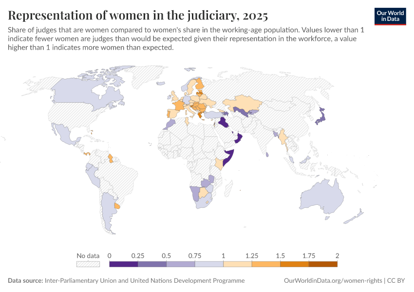 “Data Page: Representation of women in the judiciary”. Our World in Data (2026). Data adapted from Inter-Parliamentary Union and United Nations Development Programme. Retrieved from https://add-force-datapage.owid.pages.dev/grapher/representation-of-women-in-the-judiciary [online resource]How to cite this data